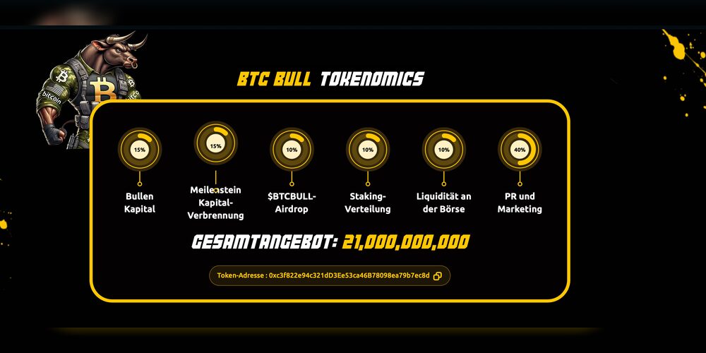 Der BTC Bull Token (BTCBULL) steht als innovatives Projekt im ständig wachsenden Segment der Meme-Coins, das neue Perspektiven für billige Coins mit Zukunft eröffnet. Anders als viele bekannte Meme-Coins, die primär auf kurzlebige Trends setzen, integriert BTCBULL eine clevere Mechanik, bei der echte Bitcoins als Airdrop-Belohnung an seine Inhaber verteilt werden. Diese Besonderheit hebt den Token deutlich von herkömmlichen Angeboten ab. Ferner kostet der BTCBULL Token im Presale rabattiert nur 0,002385 US-Dollar.