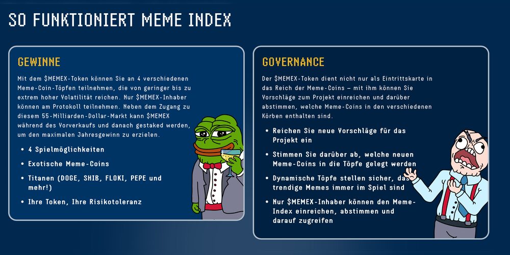 Die vier Indizes umfassen große etablierte Meme-Coins, neue Projekte mit Potenzial, mittelgroße Coins sowie hochspekulative Neulinge. Der MEMEX Token dient dabei als zentrales Element: Nur Inhaber können an den Indizes partizipieren und von zusätzlichen Staking-Belohnungen profitieren. Neben den strukturierten Investmentmöglichkeiten setzt das Projekt auf eine dezentrale Governance, bei der Token-Halter aktiv über die Zusammensetzung der Indizes abstimmen können.