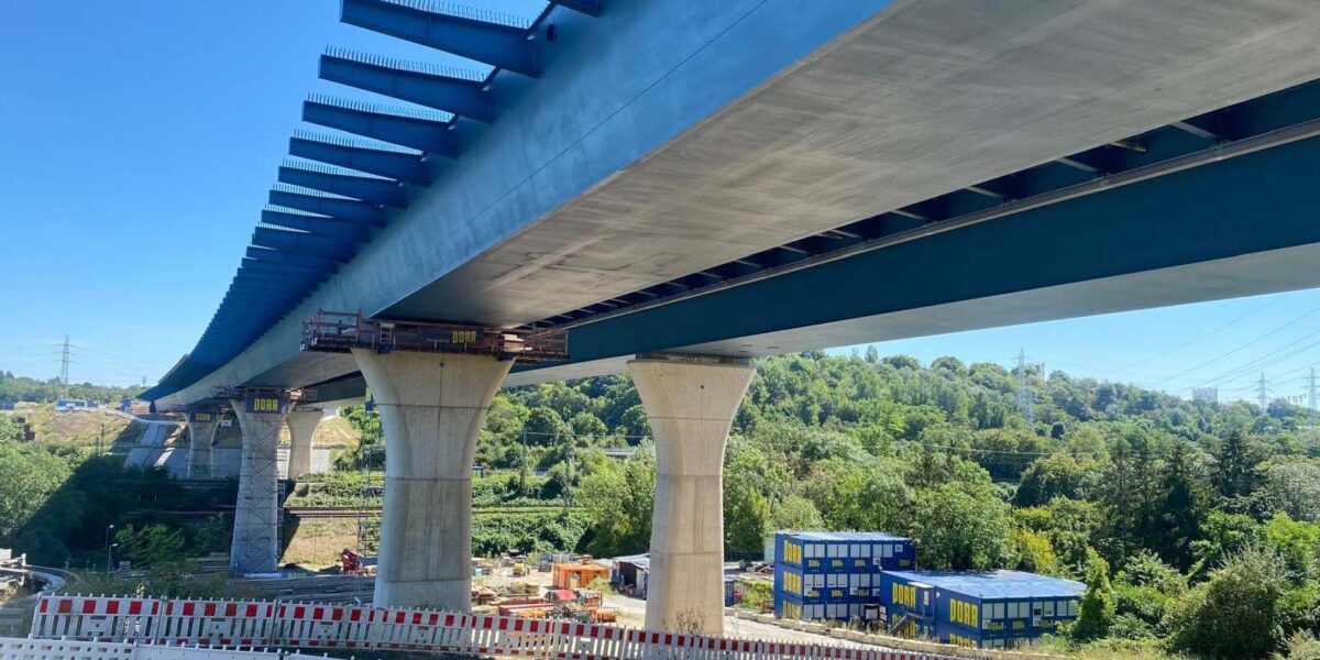 Nachdem im Juni 2024 mit dem Brückenschlag der Nordbrücke die Stahlbauarbeiten, ausgeführt vom Stahlbauunternehmen Plauen Stahl Technologie, weitestgehend beendet waren, liegt die Verantwortung für die termingerechte Fertigstellung des Überbaus jetzt ganz beim Bauunternehmen Porr. In rund zwölf Monaten muss das Stahlträgerskelett, das in vier Vorschüben über das Salzbachtal gezogen worden war, mit dem Fahrbahnaufbau verbunden werden. Dazu wurden im ersten Schritt innerhalb von drei Wochen insgesamt 164 Betonteile unterschiedlicher Typen und Längen, bis zu 4,39 Metern, auf den Unterbau aufgelegt.