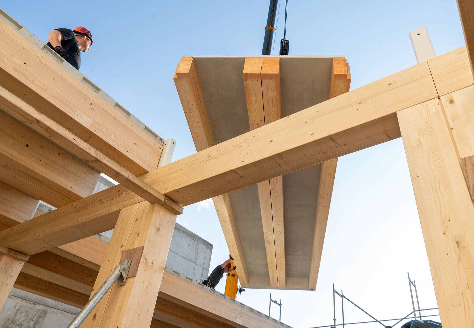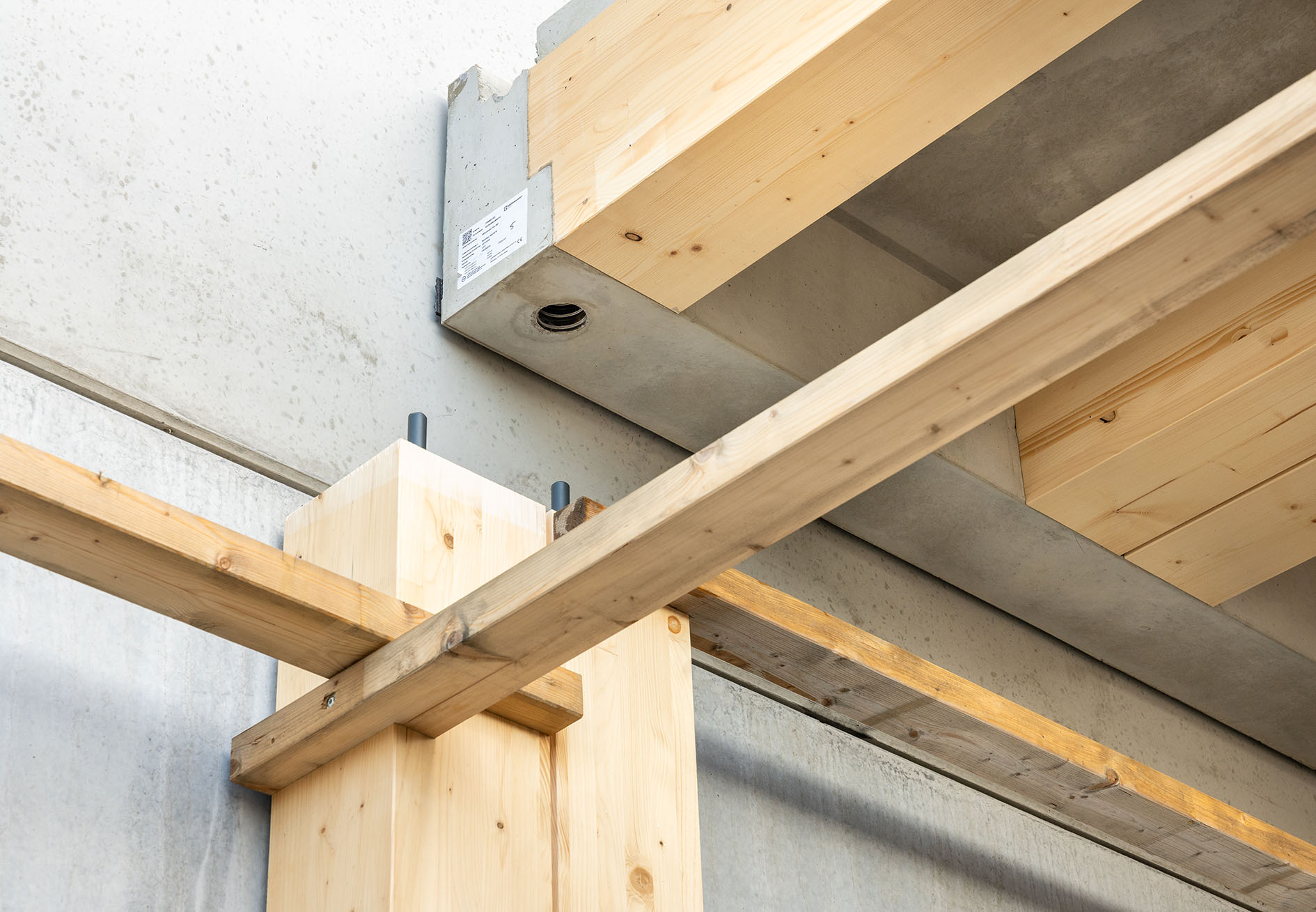 Bei der Verbindung von Holz und Beton innerhalb eines Deckenelements setzt das Unternehmen auf statisch leistungsfähige und wirtschaftlich umsetzbare Schubkerven. Die Vollgewindeschrauben der notwendigen Abhebesicherung werden durch ein innovatives Bauteil, das zusammen mit dem Kooperationspartner Reisser Schraubentechnik zur Praxisreife entwickelt worden ist, von oben zugänglich und somit lösbar. So wird der Beton vom Holz sortenrein trennbar. Zudem erhöht der neu entwickelte Verbinder – mittlerweile mit Zulassung in Form einer allgemeinen Bauartgenehmigung – die Tragfähigkeit der Abhebesicherung, sodass auf die Hälfte der sonst üblichen Schraubenanzahl verzichtet werden konnte.