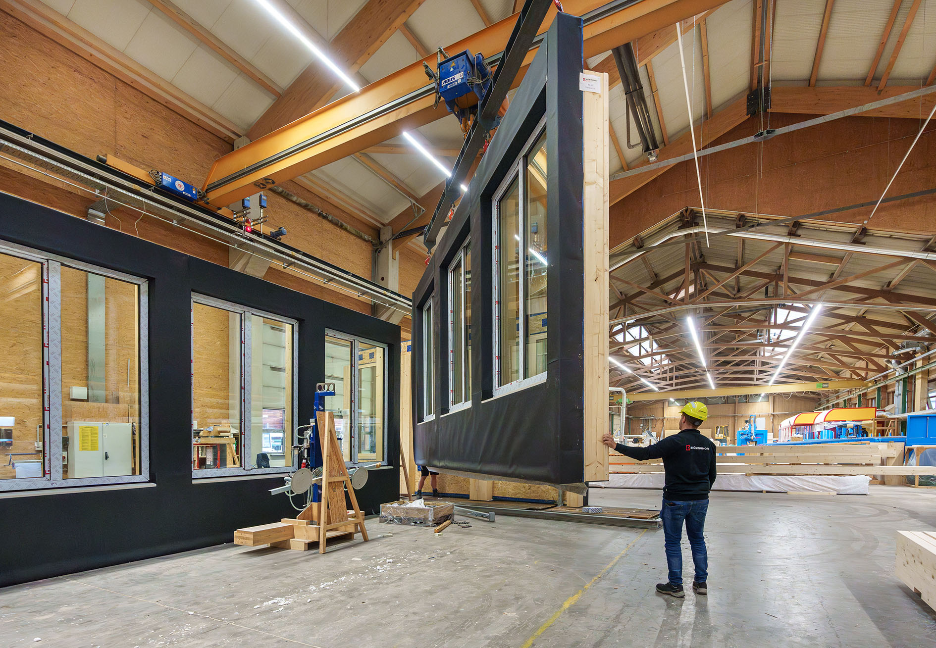 Die Wandelemente weisen einen hohen Vorfertigungsgrad auf, Dies verkürzt auch die Abläufe auf der Baustelle.