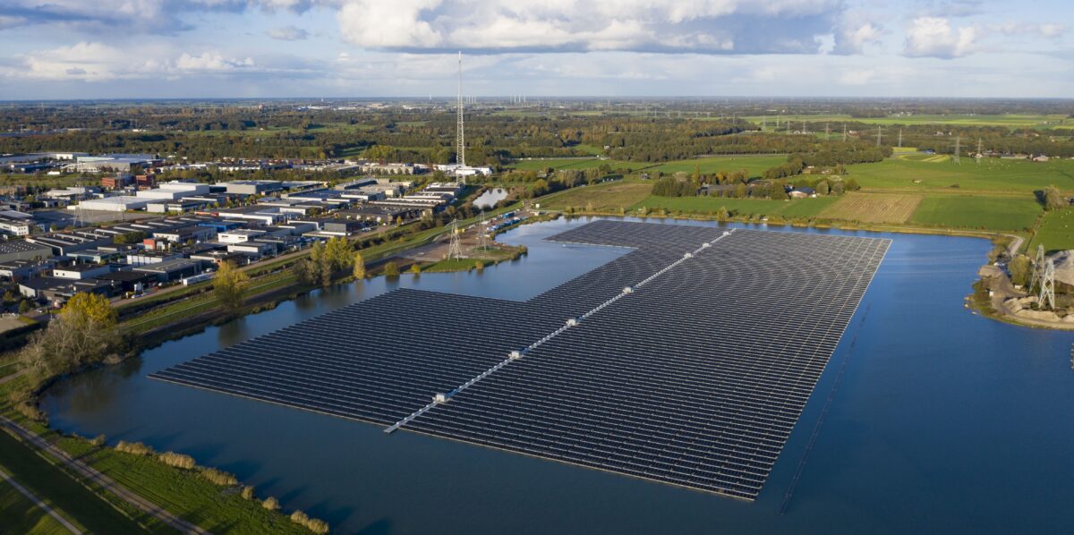 Forschende untersuchten exemplarisch die Auswirkungen von Floating-PV-Anlagen auf künstliche Gewässer. Im Bild die Anlage im niederländischen Sekdoorn nahe Zwolle.