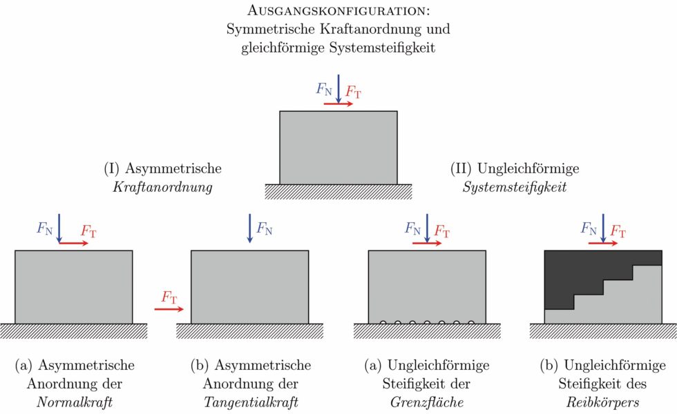 Bei einem quaderförmigen Reibkörper sollte die Tangentialkraft demnach seitlich und möglichst nahe der Grenzfläche angeordnet werden (Bild, Konfiguration I-b). Dadurch kommt es zu einer starken Erhöhung der Schubspannung an dem hinteren Ende des Reibkörpers, von dem aus das Losbrechen ausgeht. Das dabei zusätzlich entstehende Drehmoment um die Querachse (Nickmoment) begünstigt das Losbrechen sogar, weil dadurch die Verteilung von Schub- zu Normalspannung in der Grenzfläche insgesamt noch ungleichförmiger wird. Diese Maßnahme bewirkte bei den Experimenten in [4] für eine PMMA-PMMA-Paarung eine Reduk-tion der Haftreibung um mehr als 45 %.