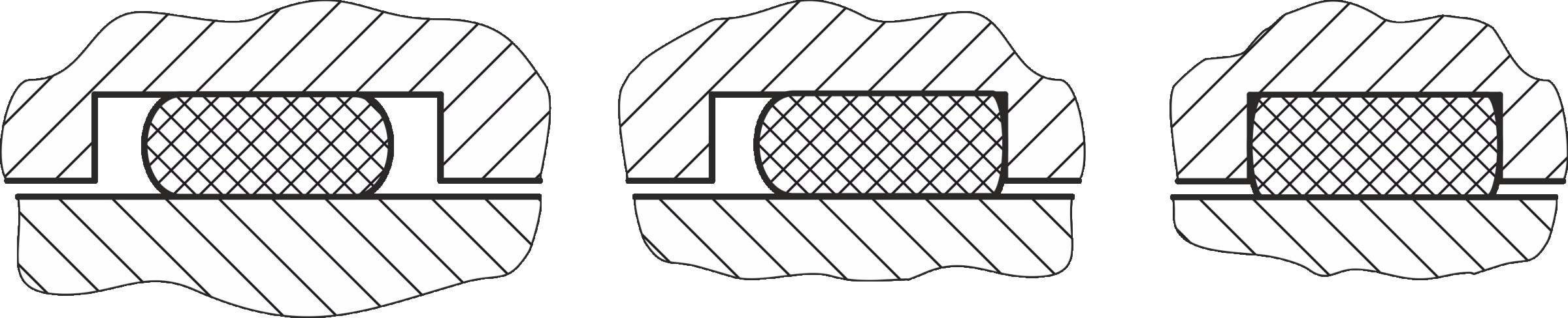 Je nach Einbausituation eines O-Rings kann es nach der Montage zu einer Anlage der Dichtung an einer oder beiden Nutwänden kommen. Entsprechend können daher, wie in Bild 3 dargestellt, drei Fälle unterschieden werden: die seitlich unbehinderte, einseitig oder beidseitig behinderte Ausdehnung.