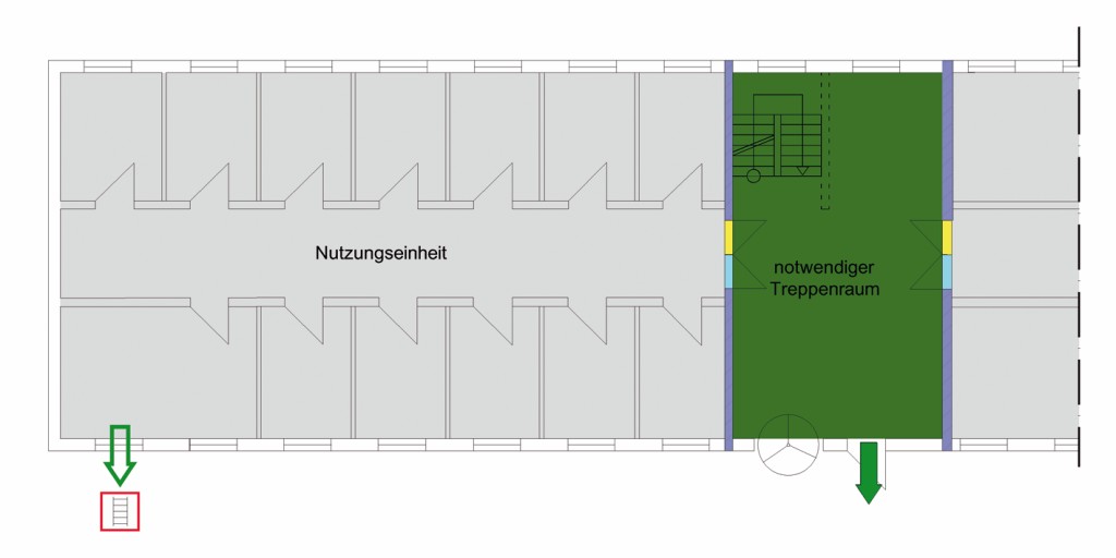 - Einschränkung der Verrauchung des notwendigen Treppenraums (z. B. durch Rauchschutztüren).