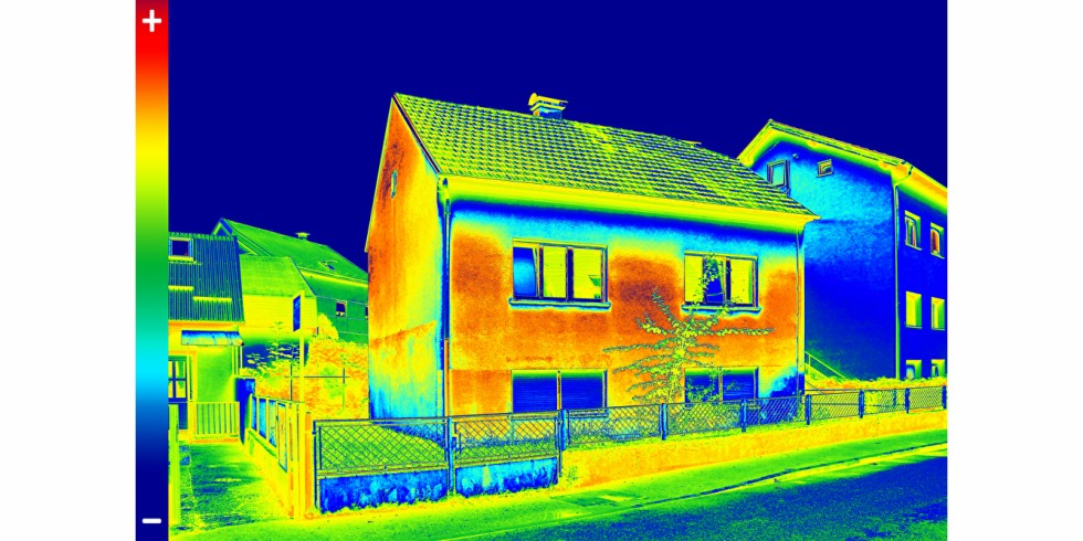 Das Wärmebild zeigt die fehlende Wärmedämmung eines Hauses.