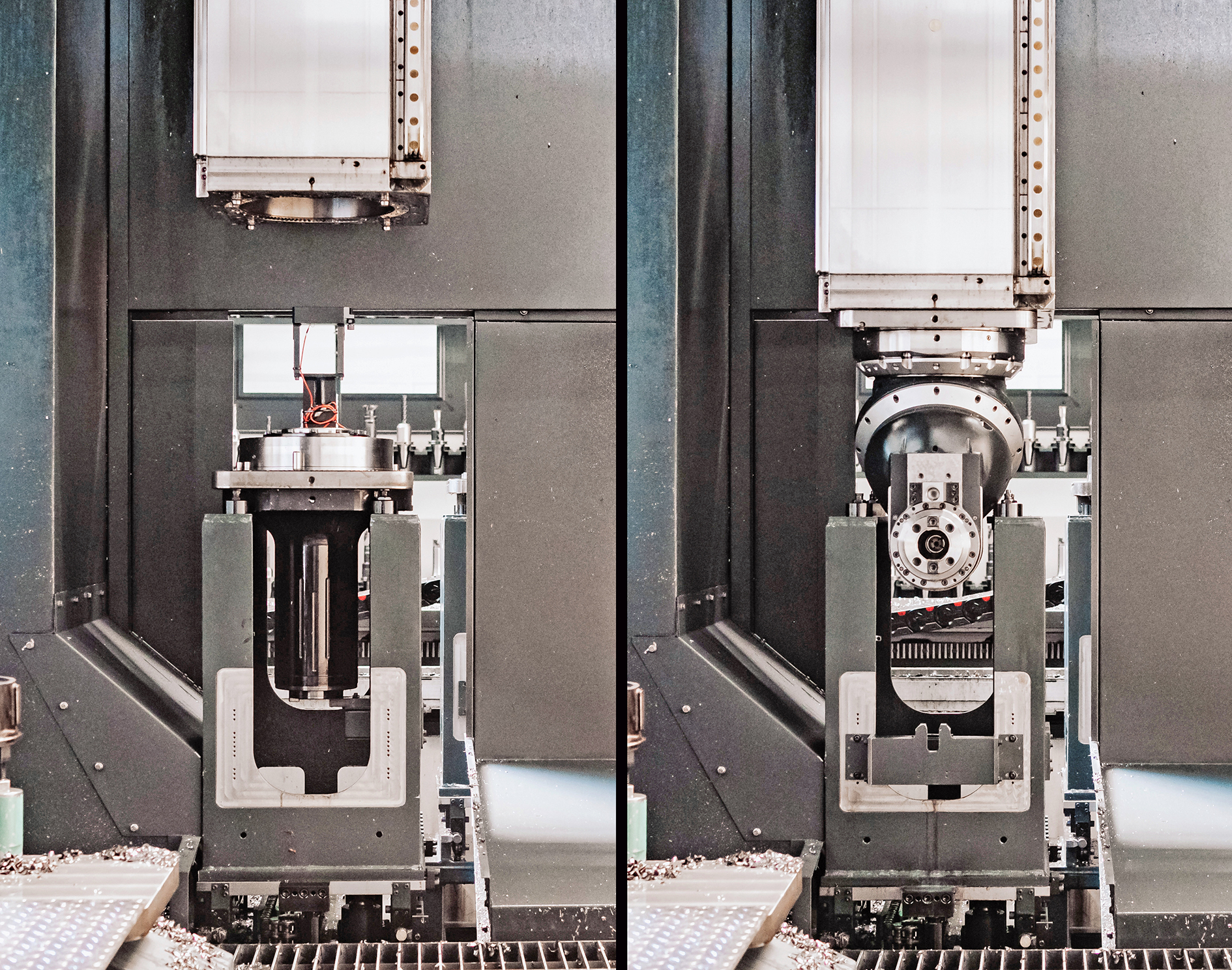 Fräsköpfe werden aus dem Speicher in der „Tool Arena“ mithilfe eines Shuttles automatisch gewechselt: Hier wird ein vertikaler Fräsvorsatz (links) gegen einen Winkelkopf getauscht.