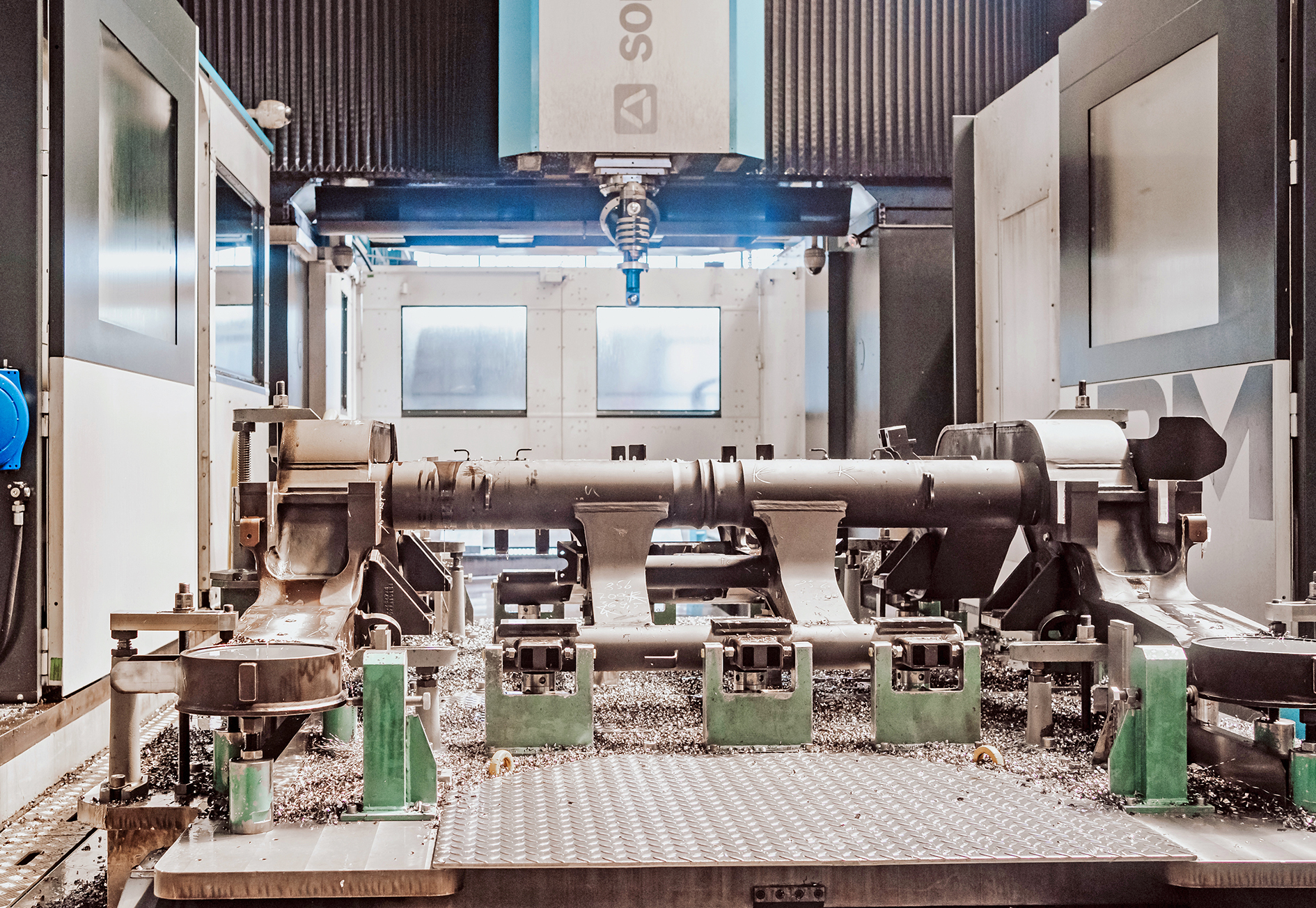 Jedes Jahr werden rund 2.500 Drehgestelle hergestellt und 1.000 Revisionen bzw. Reparaturen durchgeführt. Eine wesentliche Rolle spielt hierbei die spanende Bearbeitung. Diese umfasst alle relevanten Schritte: Dies reicht von der Beschaffung von Rohteilen wie Rahmen, Rädern und Achsen sowie der erforderlichen Zusatzkomponenten bis zur Auslieferung komplett einbaufertiger Radsätze und Drehgestelle. Die Anforderungen – sowohl an die Qualität und Genauigkeit der Bearbeitung als auch an die Termintreue der Fertigstellung – sind hierbei sehr hoch. Viele Werkstücke haben große Abmessungen von bis zu 4.000 x 3.000 x 1000 mm. Für ihre Bearbeitung kommen drei großformatige Fräsbearbeitungszentren zum Einsatz, darunter zwei Anlagen von Bimatec Soraluce.