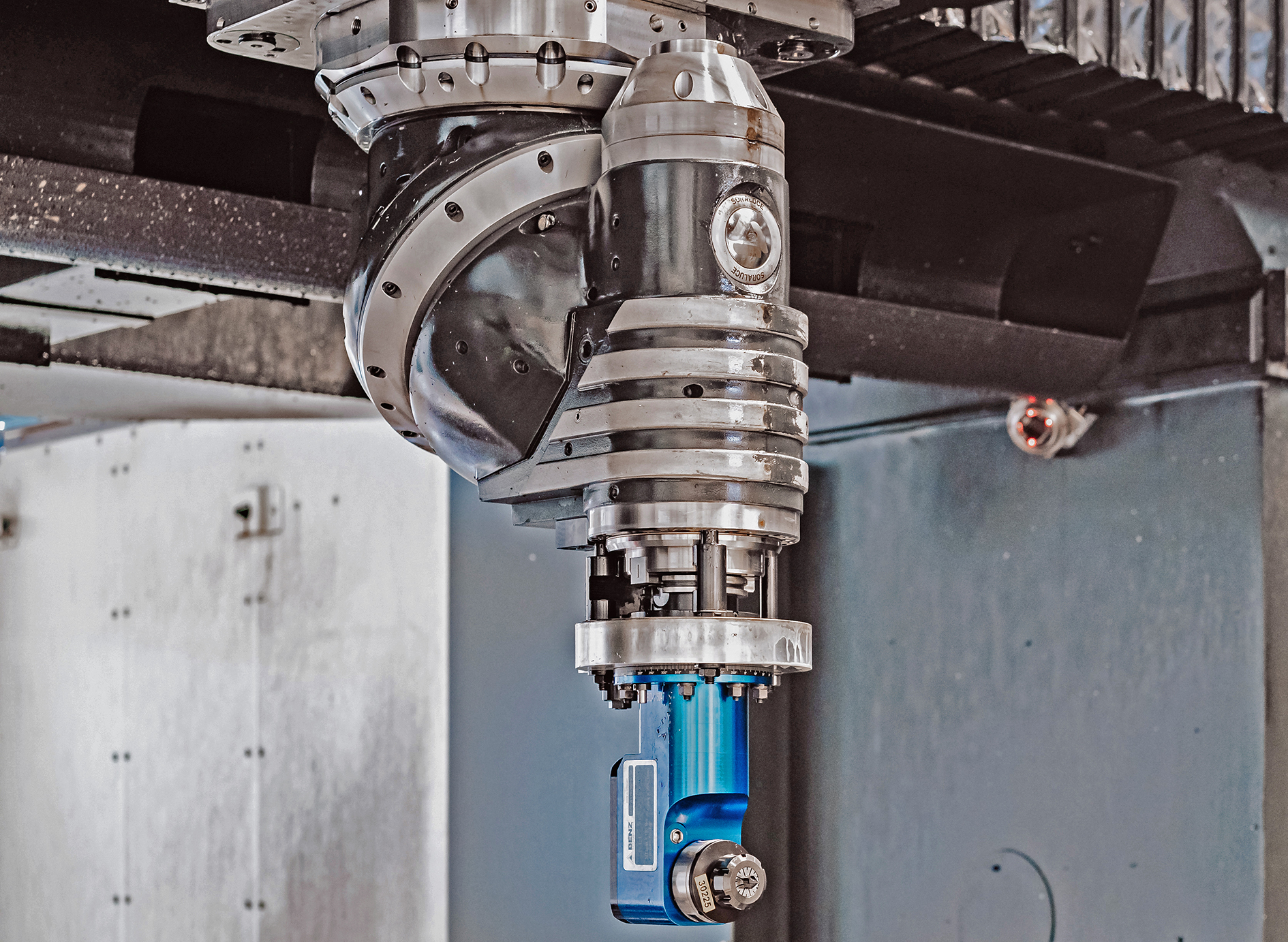 „Um die Maschine möglichst umfassend nutzen zu können, wurde sie mit einer sehr weitgehenden Automatisierung ausgestattet“, ergänzt Ramazan Ersin, Site Facility Coordinator im Werk Netphen. Das als „Tool Arena“ bezeichnete Werkzeugmagazin mit 395 Werkzeugplätzen ist seitlich angeordnet und wird von einem Roboter bedient. Hinzu kommt ein automatisches Fräskopfwechselsystem samt Pick-up-Station mit fünf Fräskopfplätzen. Zum Lieferumfang gehören derzeit vier Fräsköpfe. Im Werkzeugmagazin befinden sich zwei weitere Spezialköpfe, die vom Werkzeugwechsler wie Werkzeuge verwaltet und getauscht werden. Bei der Steuerung handelt es sich um eine „Heidenhain TNC 640“.