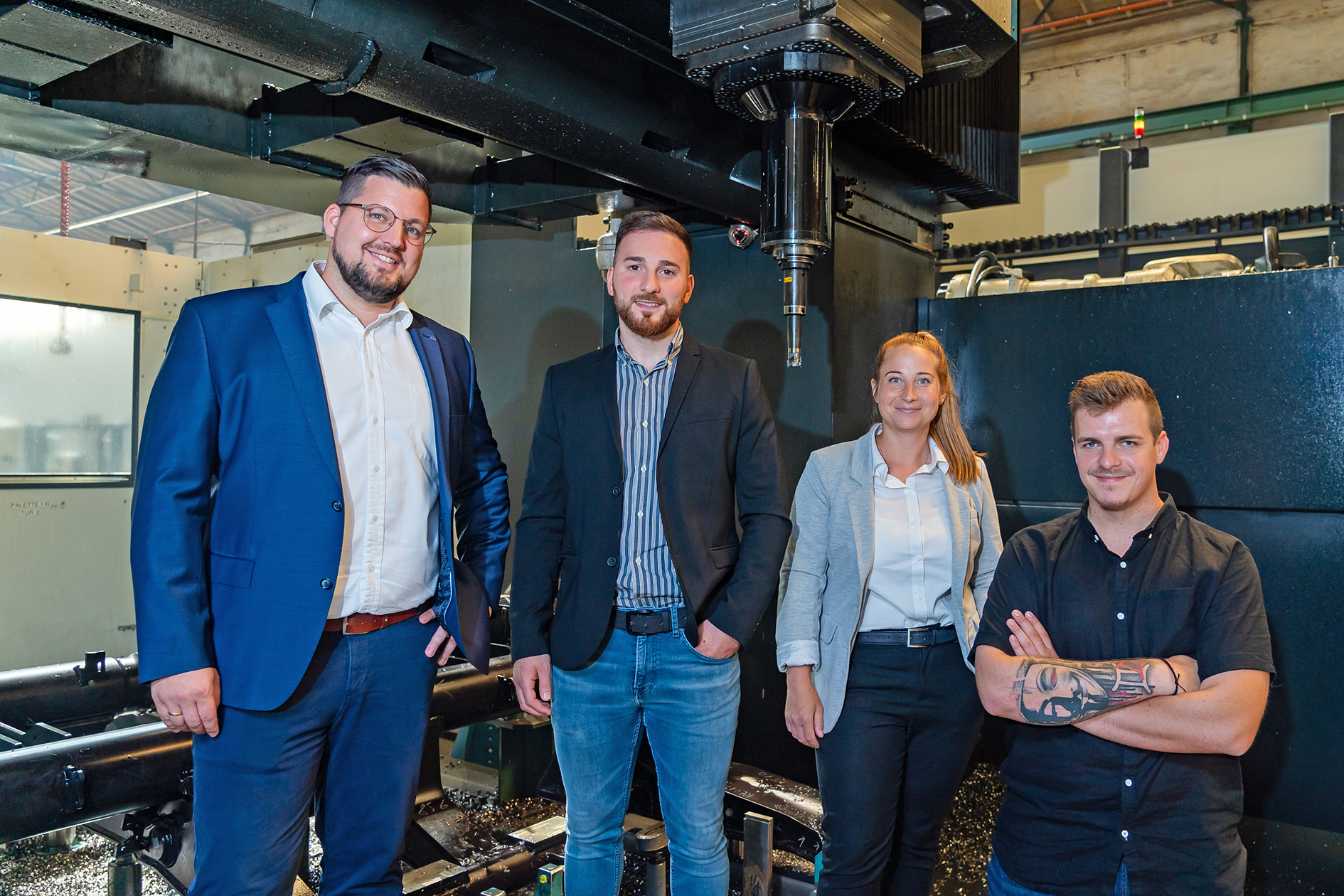 Das Erfolgs-Team: Frank Lörchner (Bimatec Soraluce, Produktmanager Automation), Ramazan Ersin (Alstom, Site Facility Coordinator), Annika Lichtenfels (Alstom, Produktionsleitung) und Tim Schirmer (Alstom, stellvertretender Meister mechanische Bearbeitung; v.l.n.r.).