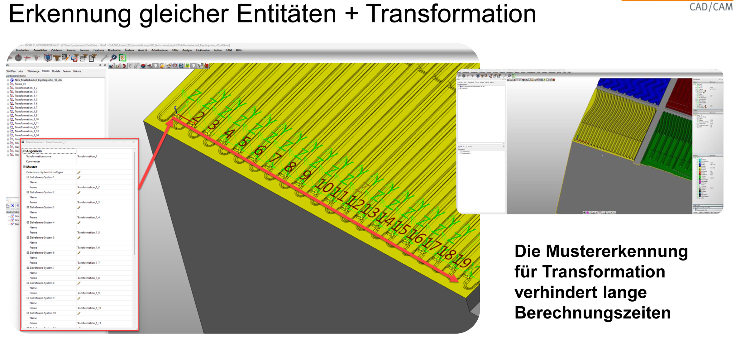 Wichtig ist auch die Verknüpfung geometrisch identischer Strukturen innerhalb eines Bauteils, die entweder automatisch oder manuell erkannt bzw. definiert werden. Die entsprechenden Werkzeugwege, die zuerst für einen einzelnen Bereich erstellt wurden, können dann über eine Transformation an die vorher erkannten oder manuell definierten Positionen gebracht und vollautomatisch verbunden werden. Dabei werden unnötige Bewegungen entfernt. Durch dieses Vorgehen lassen sich im CAM-System die Berechnungszeiten erheblich reduzieren.