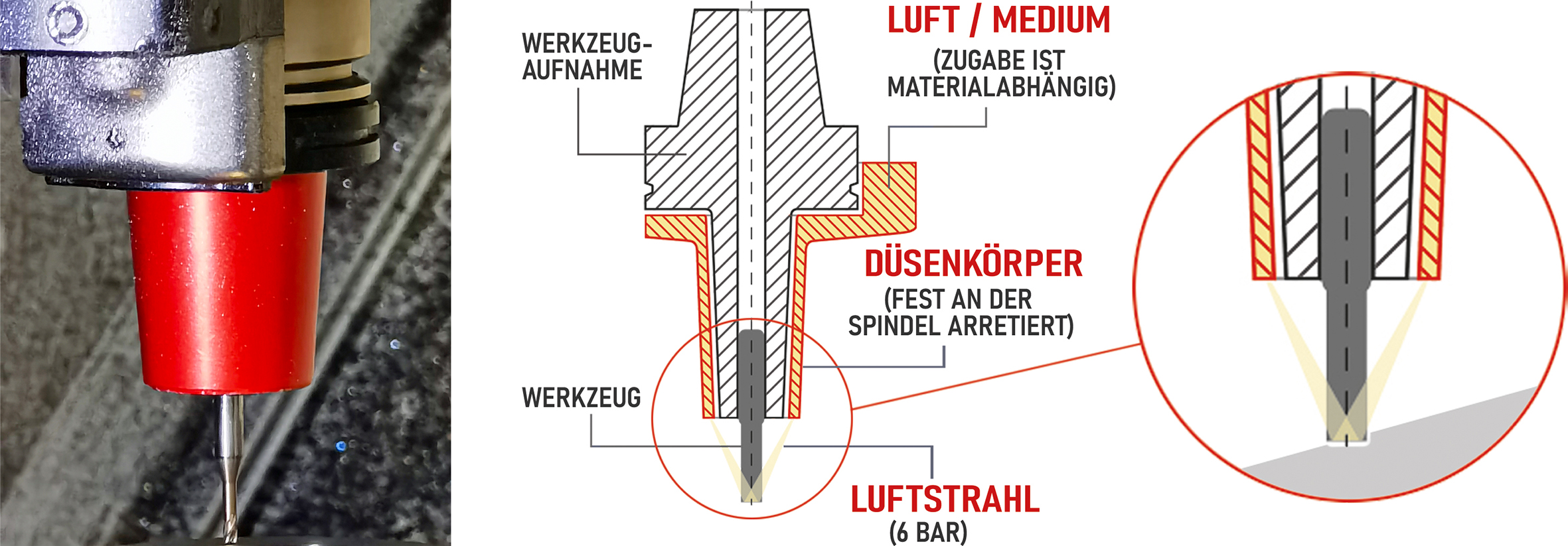 Die wesentliche Kühl- und Reinigungsarbeit übernimmt hierbei die Druckluft, die aus ringförmig angeordneten Düsen am unteren Rand der Hülse strömt. Durch den starken Luftstrahl werden die Späne samt ihrem Wärmeinhalt sofort vom Fräser und vom Werkstück entfernt. Das Schmiermedium aus sorgfältig ausgewählten Kohlenwasserstoffen wird in äußerst geringen Mengen (2–10 ml/Stunde) zugeführt. Dies genügt, um die Schneiden optimal zu schmieren. Bei der Hartzerspanung verringert sich die Wärmeentwicklung an den Schneiden um circa 50 %. Entscheidende Vorteile sind deutlich erhöhte Lebensdauern der Werkzeuge, eine höhere Zerspanungsleistung der Maschine sowie bessere Oberflächen der Werkstücke.