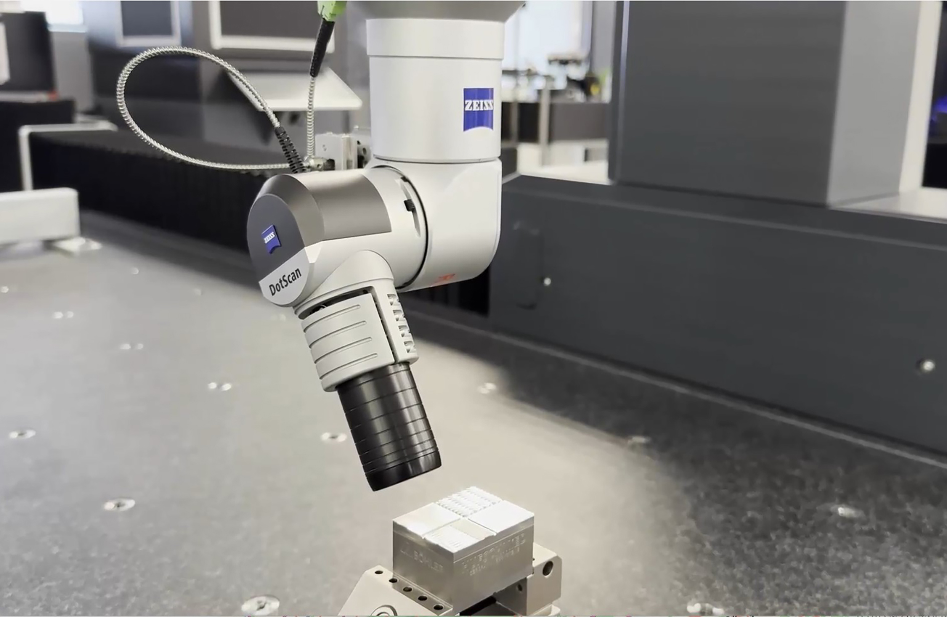 Messung des Demonstrators mithilfe des optischen Sensors Typ „Zeiss DotScan“ mit MPE von 1,8 µm + L/350 . Um die Flanken besser messen zu können, wurde er mit einer Dreh-Schwenkeinheit des Typs „RDS“ ausgestattet und auf einem“Contura“-Koordinatenmessgerät über die Probe geführt.