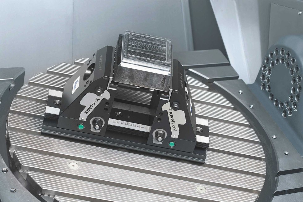 „KippflexX ist eine vielseitige Lösung für jede 5-Achs-Fräsmaschine, die sich sowohl für die Rohteil- als auch für die Niederzugspannung einsetzen lässt“, erläutert Daniel Kaupp, Vertriebstechniker Spanntechnik bei Kipp. „Das ist auf dem Markt einzigartig.“ Die patentierte Niederzugfunktion eignet sich vor allem für vorbearbeitete Werkstücke. Dank des symmetrischen Aufbaus zentriert sich das Werkstück immer mittig – eine sehr hohe Wiederholgenauigkeit ist gewährleistet. Zudem lässt sich das System wie ein Standard-Schraubstock einsetzen: Bei der Rohteilspannung kommen Spannbacken mit Pins zum Einsatz, die sich formschlüssig in das Material drücken, sodass ein zeitintensives Vorprägen entfällt.