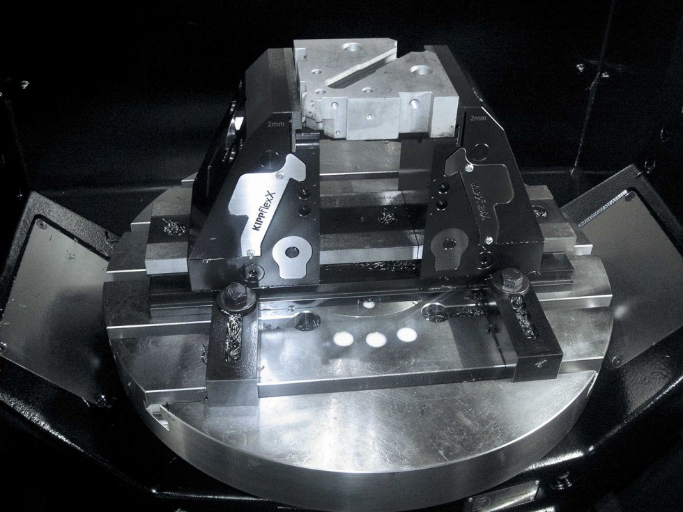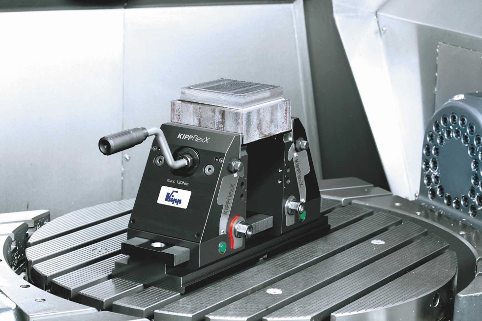Der 5-Achs-Spanner „KippflexX“ im Einsatz als Schraubstock: Über eine Kurbel ist die Schnellverstellung gewährleistet.