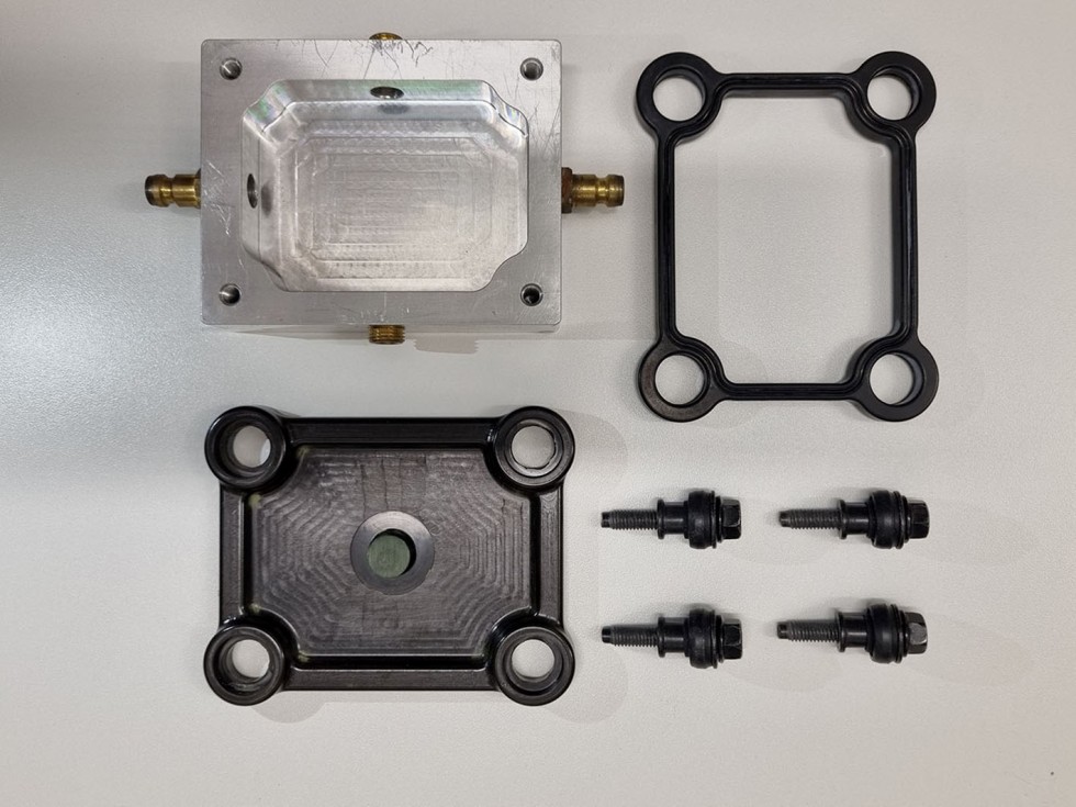 Vor der kostenintensiven Werkzeugfertigung wurden die Simulationsergebnisse mittels Probekörper validiert. In Bild 4 sind die Dichtung, die Entkopplungselemente, das Dummy-Kurbelgehäuse (KGH) und der selbst entwickelte, spritzgegossene Probekörper dargestellt.
