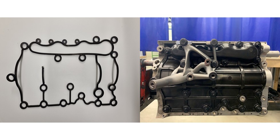 Bild 5. 3D-Dichtung (links), Aluminium-Kurbelgehäuse (rechts), FVK-Cover und Halter der Abgasanlage. Grafik: Fraunhofer ICT