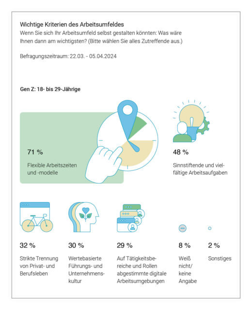 Des Weiteren zeigt sich, dass für fast drei Viertel (71 Prozent) der 18- bis 29-Jährigen flexible Arbeitszeiten und -modelle am wichtigsten wären, wenn sie ihr Arbeitsumfeld selbst gestalten könnten. Fast die Hälfte (48 Prozent) legt besonderen Wert auf sinnstiftende und vielfältige Aufgaben, gefolgt von einer klaren Trennung von Privat- und Berufsleben (32 Prozent). Diese Ergebnisse deuten darauf hin, dass die meisten jungen Berufstätigen vor allem Flexibilität im Arbeitsalltag suchen. Unternehmen, die Remote-Arbeit ermöglichen, sollten daher langfristig hybride Arbeitsmodelle einführen und kontinuierlich mit ihren Mitarbeitern weiterentwickeln.