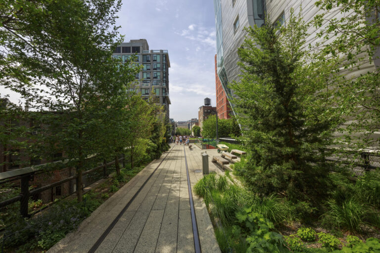 Nach der Eröffnung des südlichen Teils der High Line im Jahr 2009 folgte 2014 der nördliche Abschnitt. 2019 wurde der letzte Seitenabstecher, „The Spur“, renoviert und 2023 durch eine neu gebaute Trasse mit dem Bahnhof Penn Station verbunden. Die alten Schienen sind vielerorts erhalten geblieben, aber zwischen ihnen blühen jetzt Astern, Petunien und Goldruten. Wege und Bänke laden auf den rund 2,5 Kilometern zu Panoramablicken auf das Empire State Building und die Freiheitsstatue ein.
