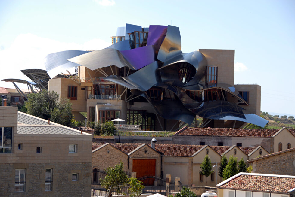 Frank Gehrys Werke sind nicht nur in den großen Metropolen dieser Welt zu bestaunen. Das Hotel Hotel Marqués de Riscal ist ein Beispiel dafür. Es steht in dem spanischen 1000-Seelen-Weindorf Elciego und bildet den Kern der „Stadt des Weines“. Es wurde von der Weinkellerei Marqués de Riscal initiiert und 2006 vom spanischen König Juan Carlos I. feierlich eröffnet. Wie auch das Guggenheim-Museum in Bilbao ist das Bauwerk mit Edelstahl und Titan verkleidet, Gehry integrierte dabei allerdings die Farben des Weingutes: Rosa, Gold und Silber.