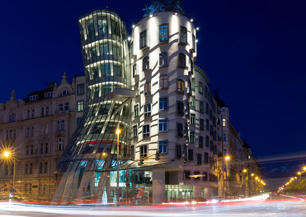 Seine gesamte Kreativität hat Frank Gehry auch beim Tanzenden Haus in Prag ausgelebt. Es entstand zwischen 1992 und 1996, wobei der ebenfalls sehr bekannte Architekt Vlado Milunić als Partner fungierte. Als Vorbild für das Bauwerk gelten Fred Astaire und seine Partnerin Ginger Rogers, wobei Astaire den steinernen und Rogers den gläsernen Turm symbolisiert. Das nicht nur in Prag einzigartige Gebäude steht direkt am Ufer der Moldau am Rašín-Kai und dient überwiegend als Bürogebäude. Im obersten Stockwerk gibt es jedoch ein Restaurant, außerdem befindet sich im Tanzenden Haus ein kleines Hotel.