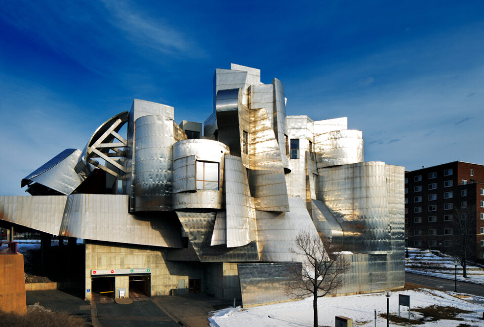 Das Weisman Art Museum steht am Ufer des Mississippi auf dem Campus der University of Minnesota. Das von Frank Gehry entworfene Gebäude wurde 1993 bezogen, bereits 1989 wurde es mit dem Pritzker-Preis ausgezeichnet, der so etwas wie der Nobelpreis für Architektur darstellt. Das Bauwerk hat zwei Gesichter, je nachdem, von welcher Seite man es betrachtet. Auf der einen Seite hat es eine Backsteinfassade, die sich in die bestehenden Backstein- und Sandsteingebäude einfügt. Auf der anderen Seite ist die Fassade mit unregelmäßig beschichteten Edelstahlteilen verkleidet, die eine Fläche aus Kurven und Winkeln bilden.