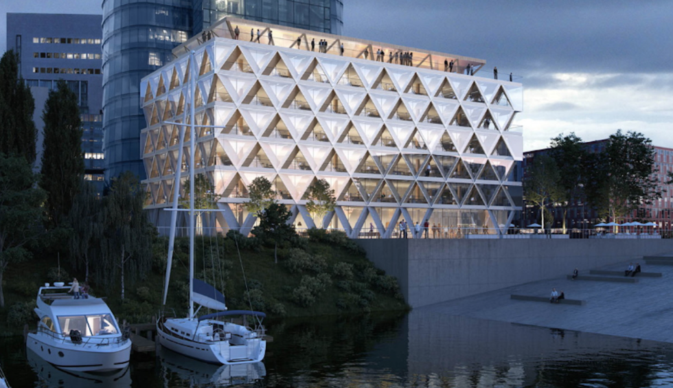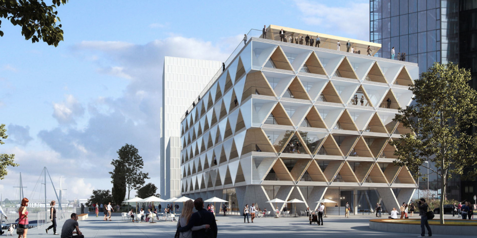 Ein Zeichen nachhaltiger Stadtentwicklung: Das Holzhybridhaus The Cradle im Medienhafen in Düsseldorf soll in den nächsten drei Jahren entstehen.