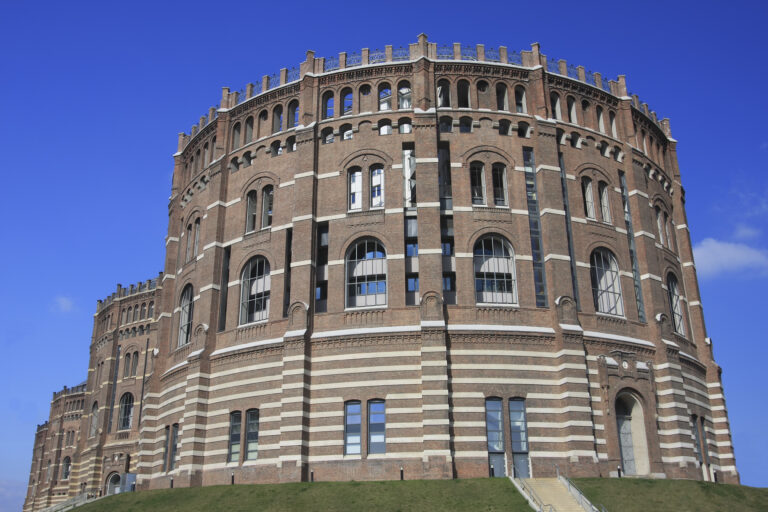 Gasometer in Wien: Die zylindrischen Glockengasbehälter mit je 90.000 Kubikmeter Gasvolumen, die in einem Wasserbassin standen, wurden mit einer Ziegelfassade umgeben.