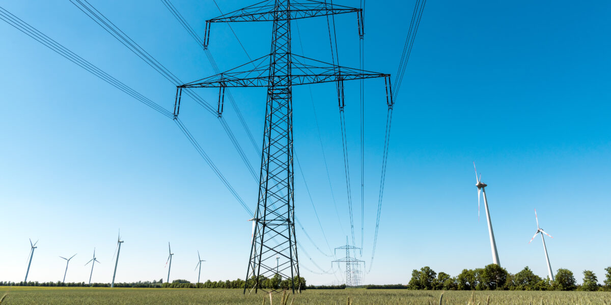 Strommast und Fernleitungen vor blauem Himmel in Deutschland: Die Bundesnetzagentur will bis 2029 die vermiedenen Netzentgelte abschaffen. Das erspart Stromkundinnen und -kunden jährlich 1 Mrd. € an bisherigen Netzentgelten.