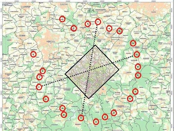 Eignet sich der Untergrund für Tiefengeothermie? 23 Sprengpunkte (rote Kreise) ermöglichen es im schwarz umrandeten Gebiet eine 3-D-Kartierung durchzuführen. Mithilfe einer ausgefuchsten Datenverarbeitung lässt sich eine 3-D-Seismik erstellen, die den Untergrund ähnlich durchsichtig macht wie eine Computertomografie den Körper.