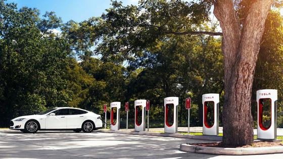 Tesla S an einer Supercharger-Station: Jetzt hat Tesla eine Batterie vorgestellt, die eine Reichweite von 600 km ermöglichen soll.