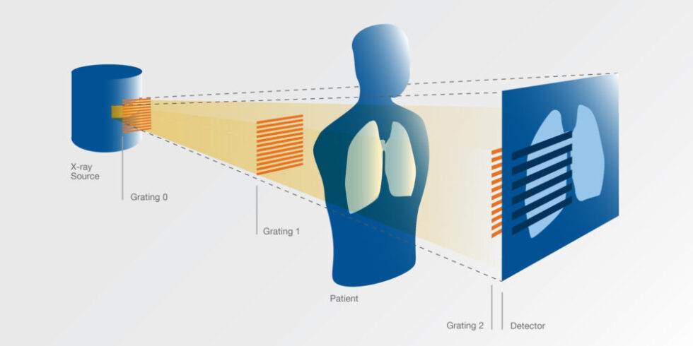 Das Röntgenlicht muss durch drei sogenannte Gitter. Dadurch ist es möglich, den gestreuten Anteil des Röntgenlichts zu nutzen.