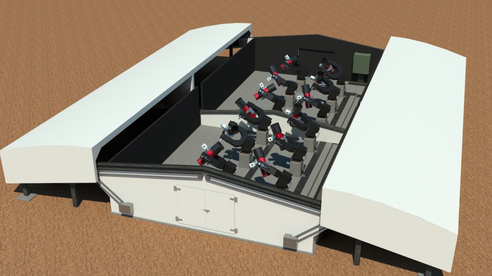 Darstellung der NGTS-Teleskopanlage: Der Next Generation Transit Survey ist ein auf großflächige Beobachtungen angelegtes System, dass aus zwölf Einzelteleskopen besteht, von denen jedes einen Durchmesser von 20 Zentimetern hat.