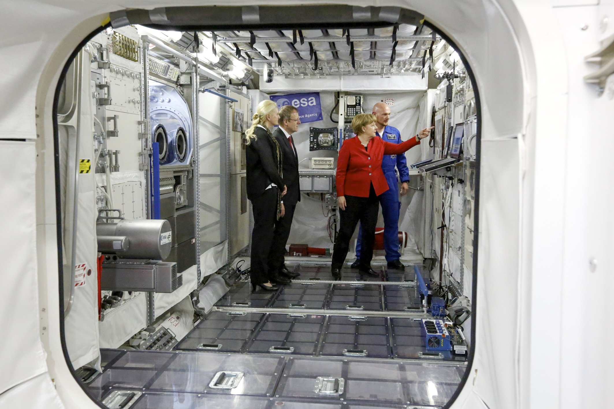Bundeskanzlerin Angela Merkel und Astronaut Alexander Gerst inspizieren einen Nachbau der ISS im Astronautenzentrum in Köln: 2018 wird der inzwischen 40-jährige Deutsche wieder auf der echten ISS im All stationiert sein – drei Monate lang als Kommandant.
