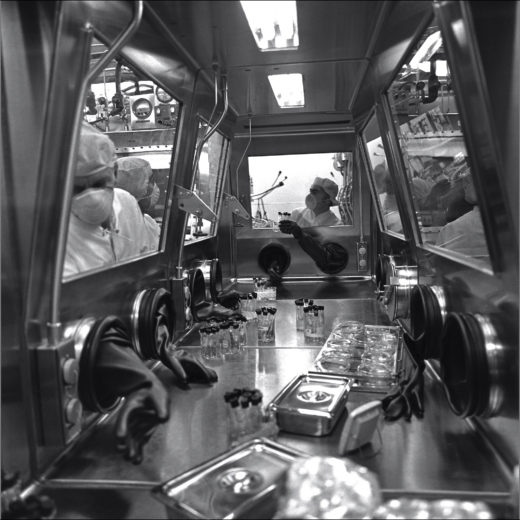 Der Mikrobiologe Ed Merek ganz links) untersucht die Proben der Apollo-11-Mission.