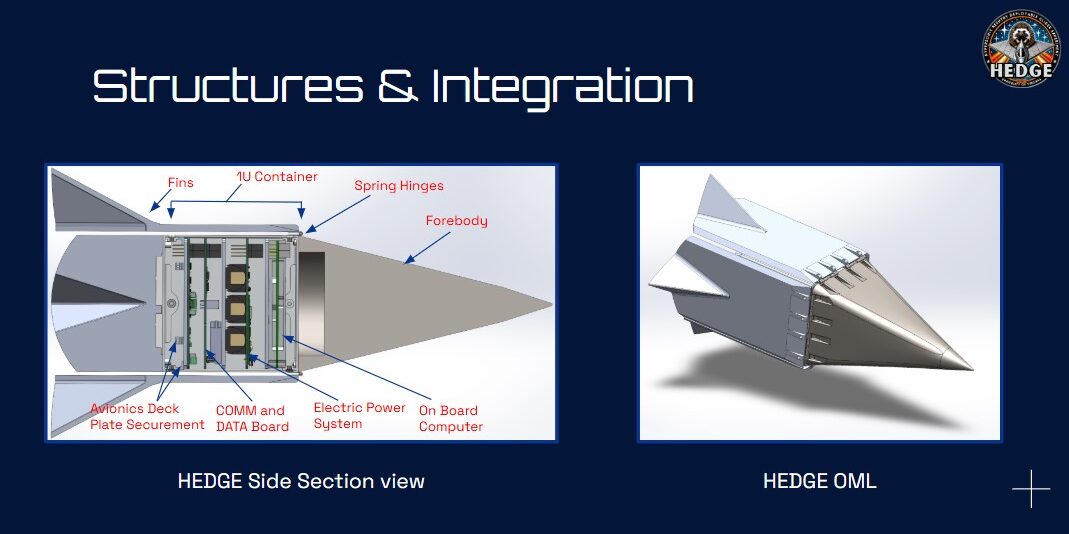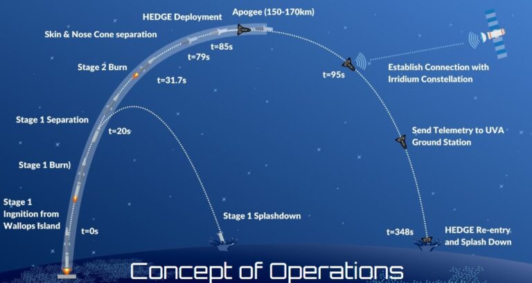 Im Flug erreicht die Rakete eine Höhe von rund 100 Meilen (etwa 160 Kilometer). Dort wird HEDGE ins All entlassen und beginnt seinen Flug zurück zur Erde. Innerhalb einer Sekunde muss sich der Mini-Gleiter stabilisieren. Dazu fährt er Flügelähnliche Stabilisatoren aus und gleitet dann mit Hyperschallgeschwindigkeit in die Atmosphäre.