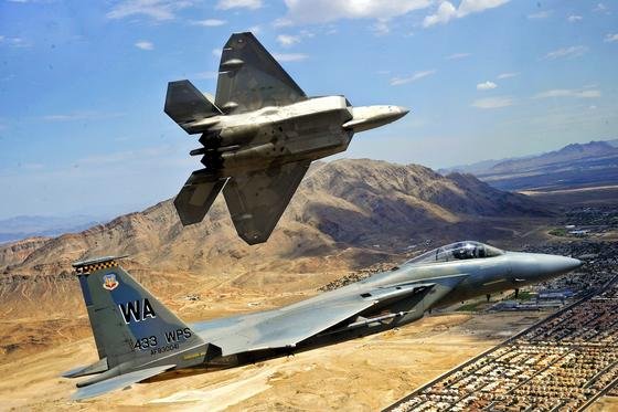Das Überschall-Flugzeug F-22 Raptor (oben) flog nach syrischen Medienberichten 50 Einsätze gegen Stellungen der Terrorgruppe IS in Syrien. Es war der erste Kampfeinsatz des Überschall-Jets überhaupt. Im Bild ein Testflug in der Nähe der Nellis Air Force Base in Nevada. Die Triebwerke liegen tief im Inneren der Maschine, damit das Radarecho minimal ist. Unten im Bild zu sehen ist eine F-15 Eagle.