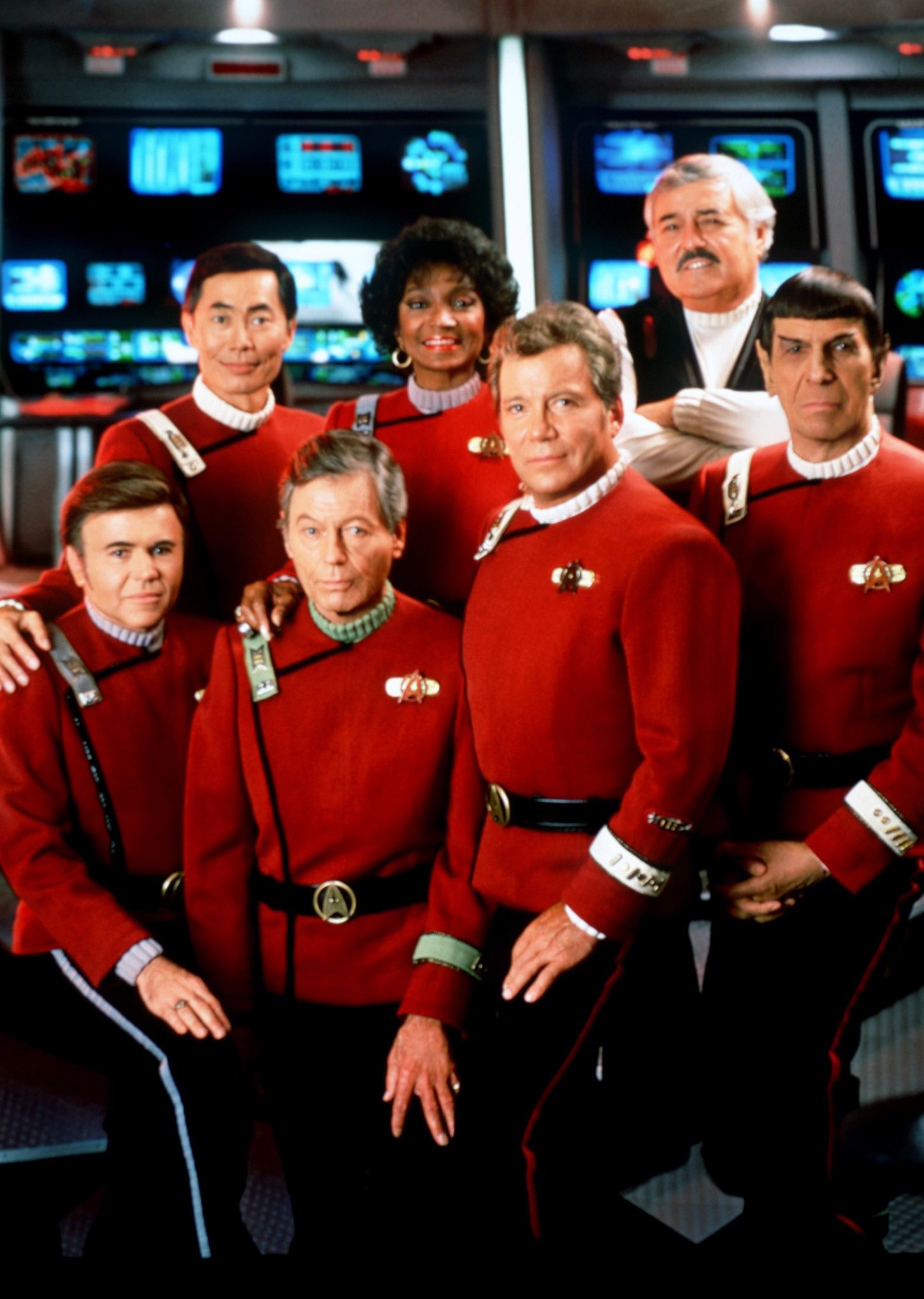 Die Crew des Raumschiff Enterprise in einer Szene des Films „Star Trek VI“ (1991). Rechts im Bild: Der Halb-Vulkanier Mr. Spock, seit 1966 gespielt von Leonard Nimoy.