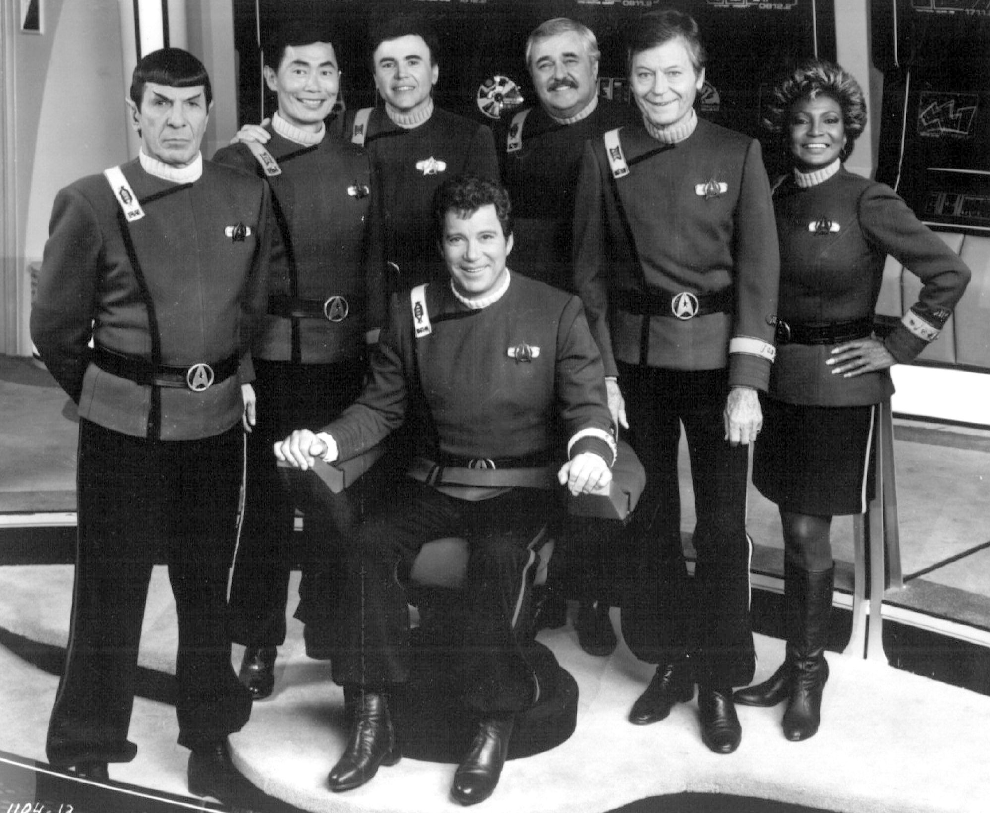 Die alte Star Trek-Crew um Captain James T. Kirk (William Shatner, vorne): (l-r) Mr. Spock (Leonard Nimoy), Sulu (George Takei), Navigator Chekov (Walter Koenig), Chefingenieur Scott (James Doohan), „Pille“ McCoy (DeForest Kelley) und Kommandant Uhura (Nichelle Nichols).