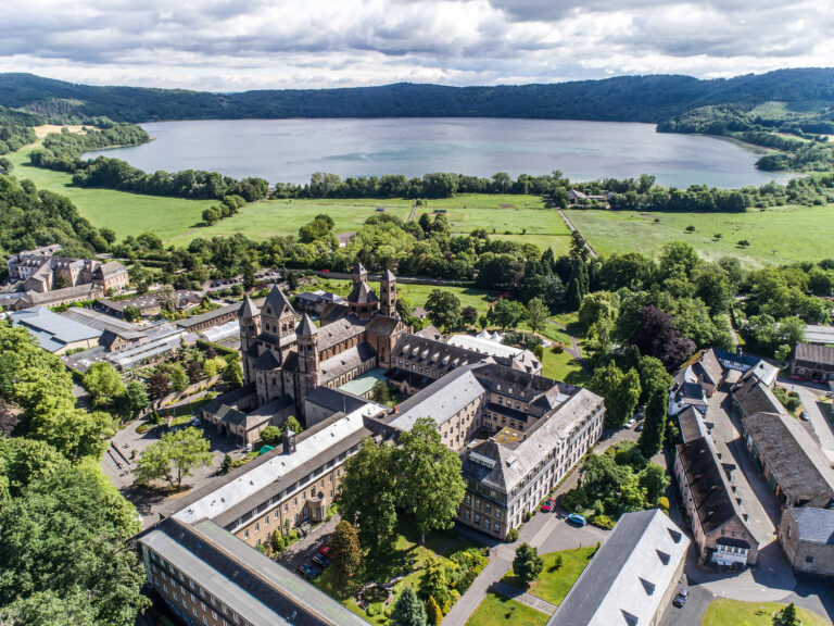 Luftaufnahme vom Laacher See hinter der berühmten Abtei Maria Laach in Rheinland-Pfalz.