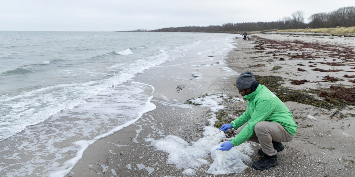Greenpeace-Kampagnenleiter Dr. Julios Kontchou entnimmt in Kühlungsborn Proben von Meeresschaum zur Untersuchung auf PFAS.