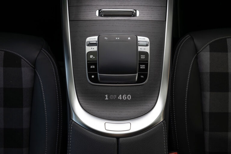 Auch im Innenraum greift Mercedes zahlreiche Gestaltungselemente der 80er-Jahre auf. Die Sitze kombinieren schwarze Leder-Außenbahnen mit taubengrauem Stoff in der Mitte – ein Design, das bereits damals beliebt war. Der Haltegriff auf der Beifahrerseite trägt den Schriftzug „Stronger Than The 1980s“, während auf der Mittelkonsole eine Plakette verrät, welches Fahrzeug der auf 460 limitierten Serie Sie gerade fahren.