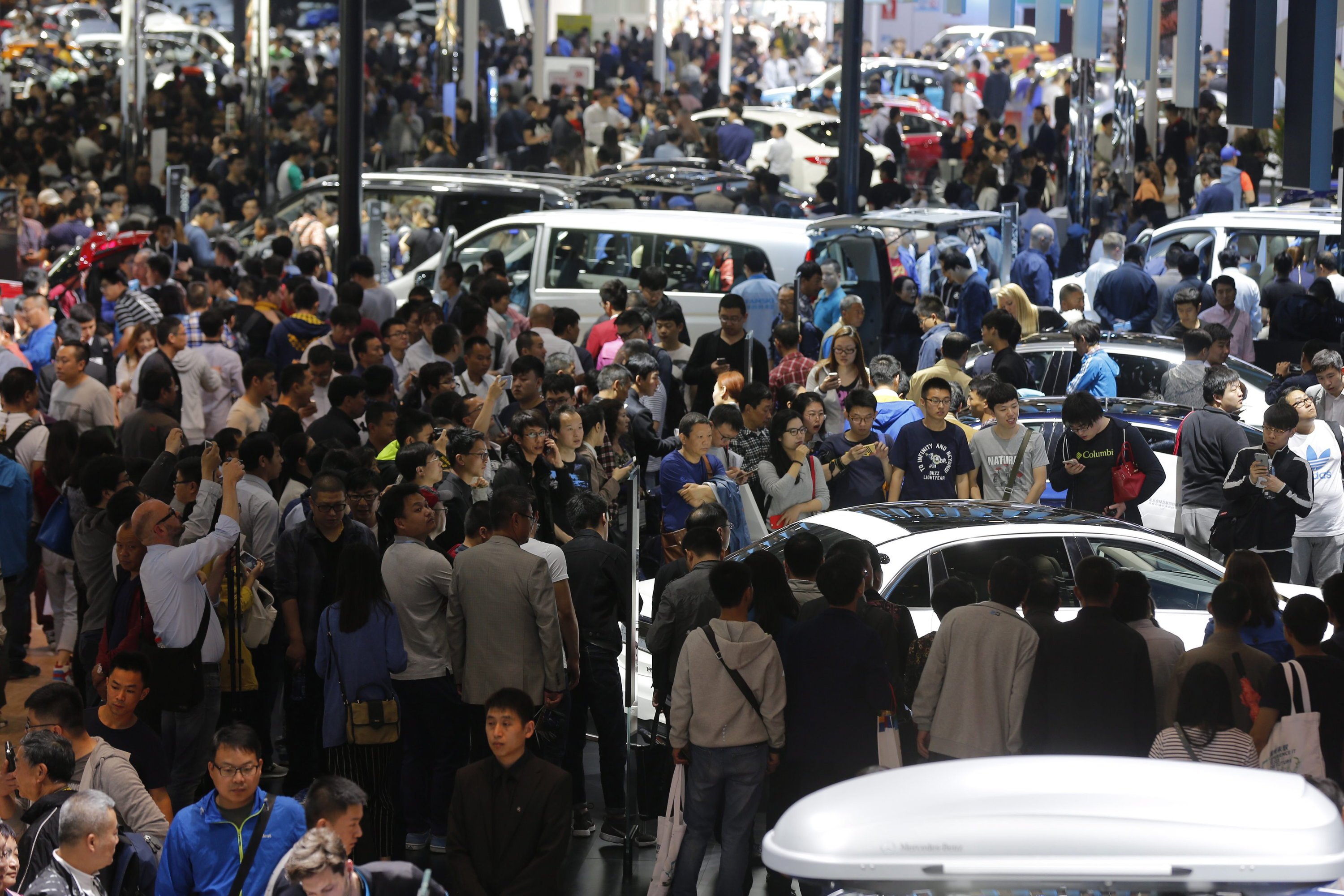 Der Andrang des Publikums auf der Auto China 2016 ist unglaublich. Teilweise stehen die Besucher im Stau, Schilder fordern zum Weitergehen auf.