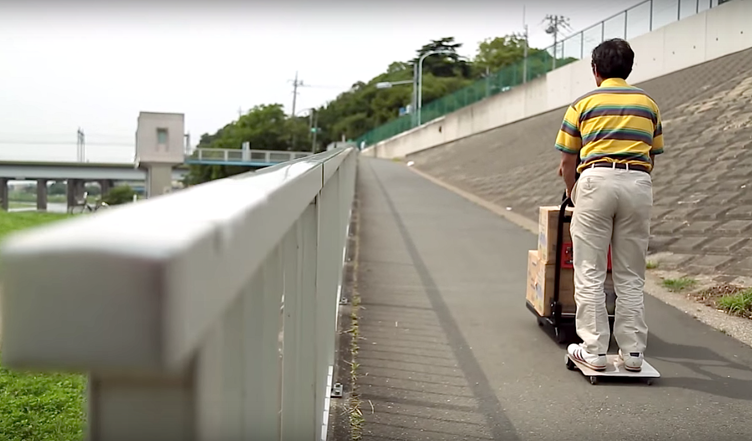 Ein Mann schiebt mit dem Walkcar eine Transportkarre den Berg hoch. Mit einer Akkuladung schafft das elektrische Rollbrett eine Reichweite von 12 km.