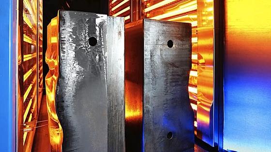 Jetzt fahren die Formen durch eine Wärmestraße, die kurzwellige Infrarotstrahlen aussendet. Die Heizanlage des Hanauer Unternehmens Heraeus Noblelight sorgt dafür, dass die Formen exakt auf die gewünschte Temperatur erwärmt werden. Während des Aufheizens registrieren Thermoelemente auf der Oberfläche der Formen die aktuelle Temperatur. Diese Daten regeln die Intensität der Infrarotmodule, die zwischen null und 100 Prozent beliebig wählbar ist. Die Presslinge aus Titan werden anschließend hineingelegt, um bei 900 Grad Celsius gewissermaßen fertiggebacken zu werden.