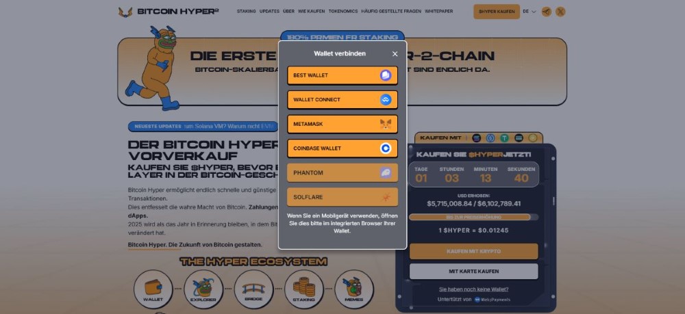 Bitcoin Hyper ist aktuell ausschließlich über den offiziellen Presale auf bitcoinhyper.com verfügbar. Sie benötigen eine kompatible Wallet wie Best Wallet oder MetaMask und können mit ETH, USDT, BNB oder Kreditkarte bezahlen. Der Presale läuft in mehreren Phasen mit steigenden Preisen von $0,0115 bis etwa $0,013.
