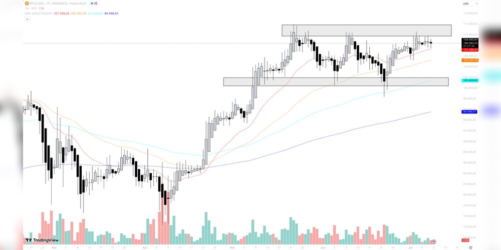 Bitcoin befindet sich nämlich seit Mitte Mai in einer klar definierten Seitwärtsphase. Die Kursbewegung verläuft derzeit zwischen der psychologisch wichtigen Marke von 100.000 US-Dollar und einem Widerstandsbereich bei 110.000 bis 112.000 US-Dollar. Aus charttechnischer Sicht handelt es sich um eine saubere Konsolidierung innerhalb eines übergeordneten Aufwärtstrends.