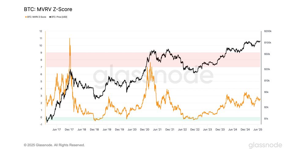 Ein Blick auf den aktuellen Chart von Glassnode zeigt deutlich, dass die letzte klare Überbewertung im Jahr 2021 passierte, als der Z-Score zeitweise deutlich über die kritische Schwelle von 7 hinausging. Im anschließenden Bärenmarkt 2022 fiel der Indikator über weite Strecken unter den Bereich von 1 und signalisierte damit eine markante Unterbewertung. Seither bewegt sich der Z-Score überwiegend im neutralen Korridor. Die aktuelle Lage deutet darauf hin, dass Bitcoin im Vergleich zu früheren Zyklen noch nicht überhitzt ist. Entsprechend bleibt weiteres Aufwärtspotenzial bestehen.