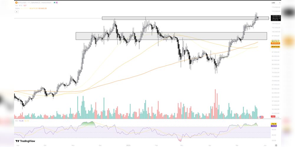 Doch die Gewinnmitnahmen wurden rasch aufgefangen, der Markt zeigte sich stabil. Inzwischen nähert sich Bitcoin erneut der Marke von 110.000 US-Dollar. Schon bald könnte ein Short Squeeze folgen, der deutlich höhere Kurse ermöglicht.