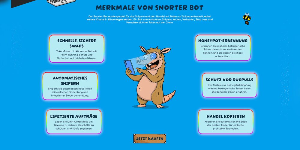 Snorter tritt derweil im Sommer 2025 nicht als klassischer Memecoin auf, nutzt jedoch gezielt das Branding rund um Memes, um Aufmerksamkeit zu erzeugen. Doch hinter dem spielerischen Auftritt verbirgt sich ein durchdachtes Trading-Tool – konzipiert für schnelle, taktische Entscheidungen in einem extrem volatilen Markt. Wer im Bereich der besten Memecoins im Juli 2025 erfolgreich agieren will, braucht genau solche Lösungen.